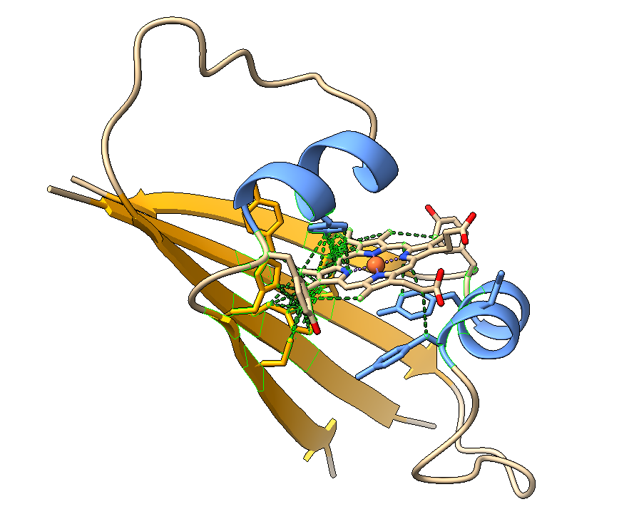 La interacción con hemo crea una estructura distinta, relativamente estable (probabilidad 70%). Un problema de esta estructura es que el átomo de hierro tiene libres las posiciones de coordinación encima y debajo del plano de hemo.