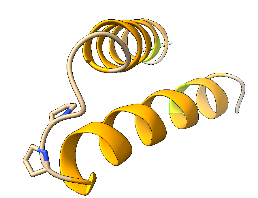 Las dos prolinas en HAPPY son claves. La prolina es un aminoácido bastante peculiar, ya que es una amina secundaria que forma un anillo. La prolina rompe las hélices, creando una torsión que da punto de giro. Esta parte de la estructura es fundamental para «enfrentar» las dos hélices, y la torsión se asemeja a la cadena simple de colágeno.