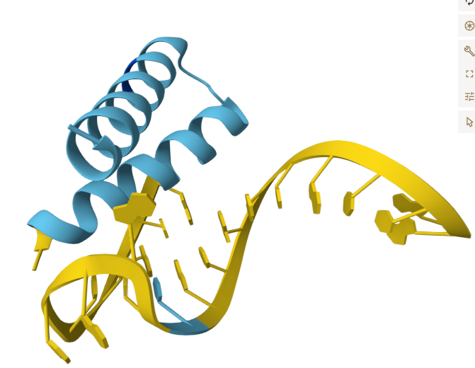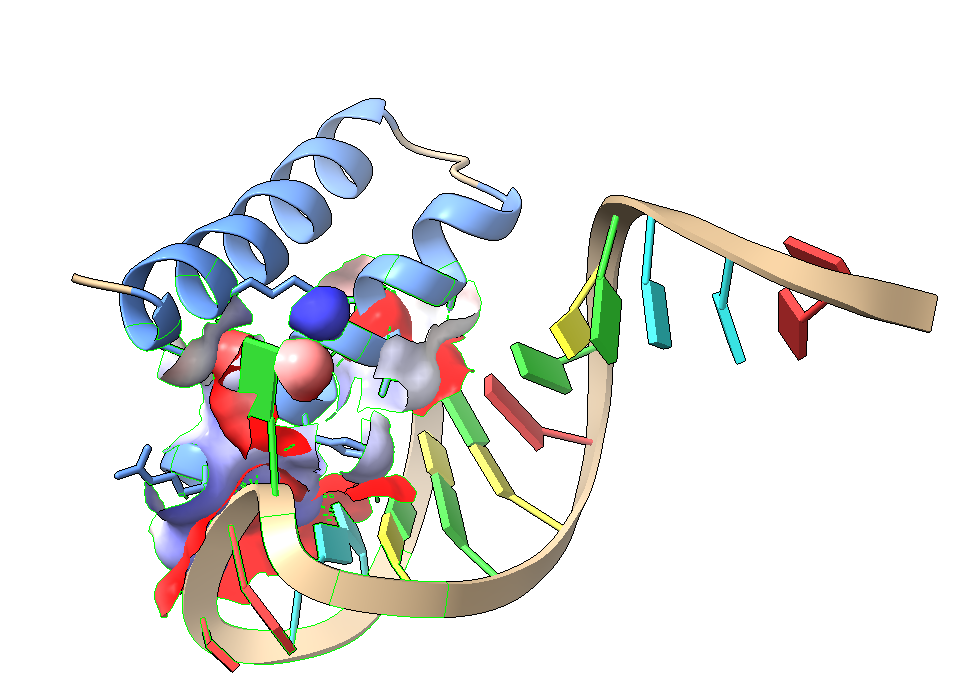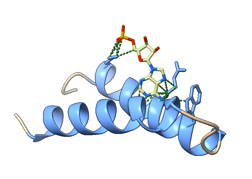 La predicción nos dice que es posible, aunque con una probabilidad más baja (60%). La estructura resultante estabiliza las hélices del péptido de navidad y muestra muchos contactos con la molécula de RNA:
