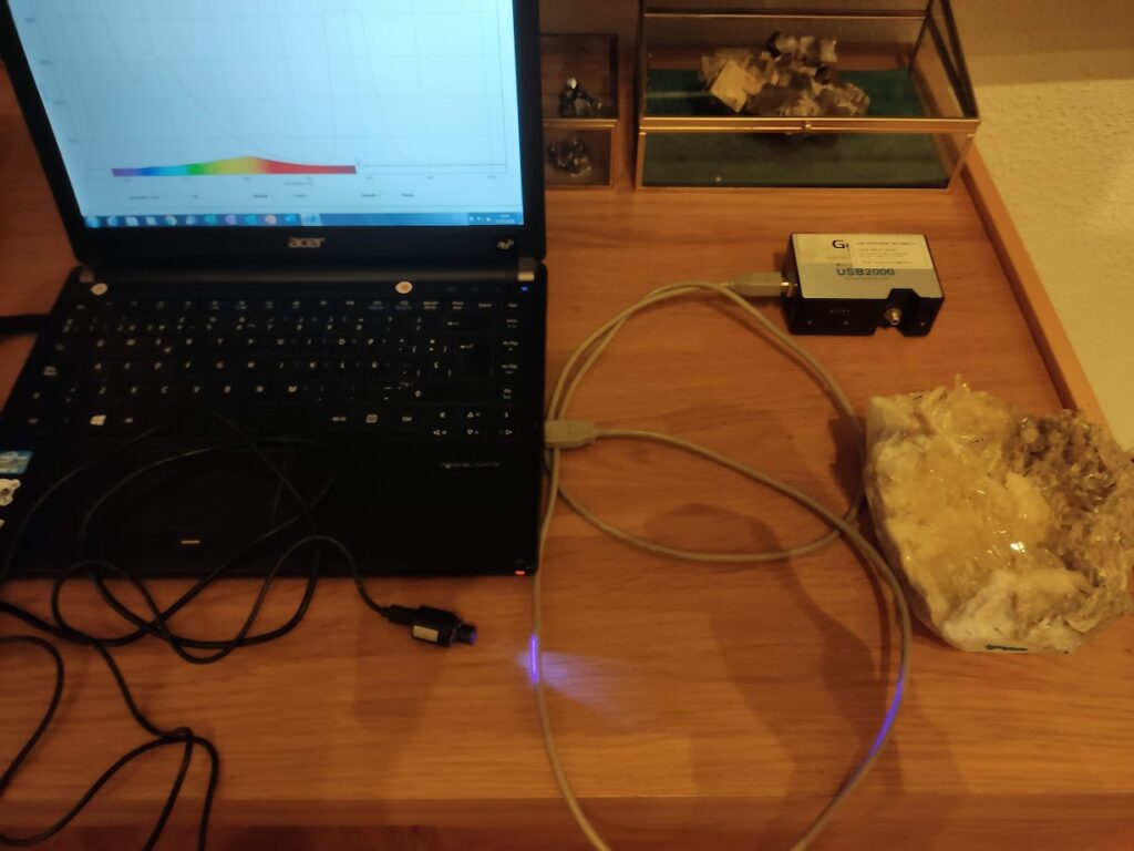 En el caso del uranilo, la transición electrónica responsable de la emisión de luz es un retorno desde un estado excitado de tipo ligando-a-metal hacia el estado fundamental, con una vibración simétrica característica acoplada a esa emisión. El resultado es este espectro de “códigos de barras” verde. Su presencia en la adamita confirma que el activador de su fluorescencia es UO₂²⁺ (uranio en estado de oxidación +6), probablemente incorporado durante la formación del mineral en cantidades traza.