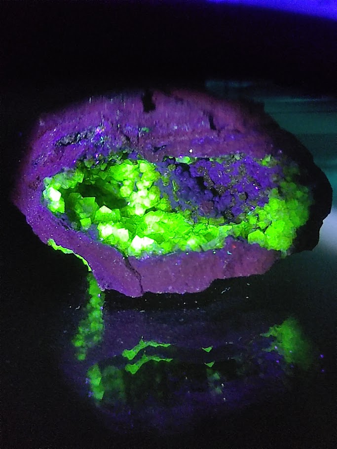 Nos trasladamos a Mapimí, en el semidesierto de Durango (México), donde la antigua mina de Ojuela ha dado ejemplares mundialmente famosos de adamita fluorescente. La adamita es un arseniato de zinc (Zn₂AsO₄OH) que en sí misma no es especialmente luminiscente. El secreto de su intensa fluorescencia verde está en diminutas impurezas de uranio incorporadas en su estructura, en forma de iones uranilo (UO₂²⁺) sustituyendo parcialmente al zinc o presentes en inclusiones microscópicas. Bajo la luz UV de onda larga o violeta azulada, estas muestras emiten una luminosidad verde inconfundible.