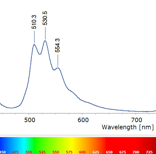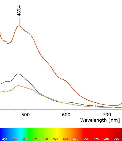 Al registrar el espectro de fluorescencia de estas muestras (Figura 3), en lugar de picos definidos se observa una banda ancha que abarca buena parte del azul, con un máximo alrededor de ~486 nm (azul verdoso) y se extiende al amarillo. ¿Qué está provocando esta fluorescencia y por qué su espectro es tan diferente?